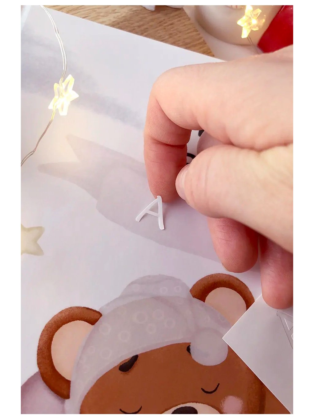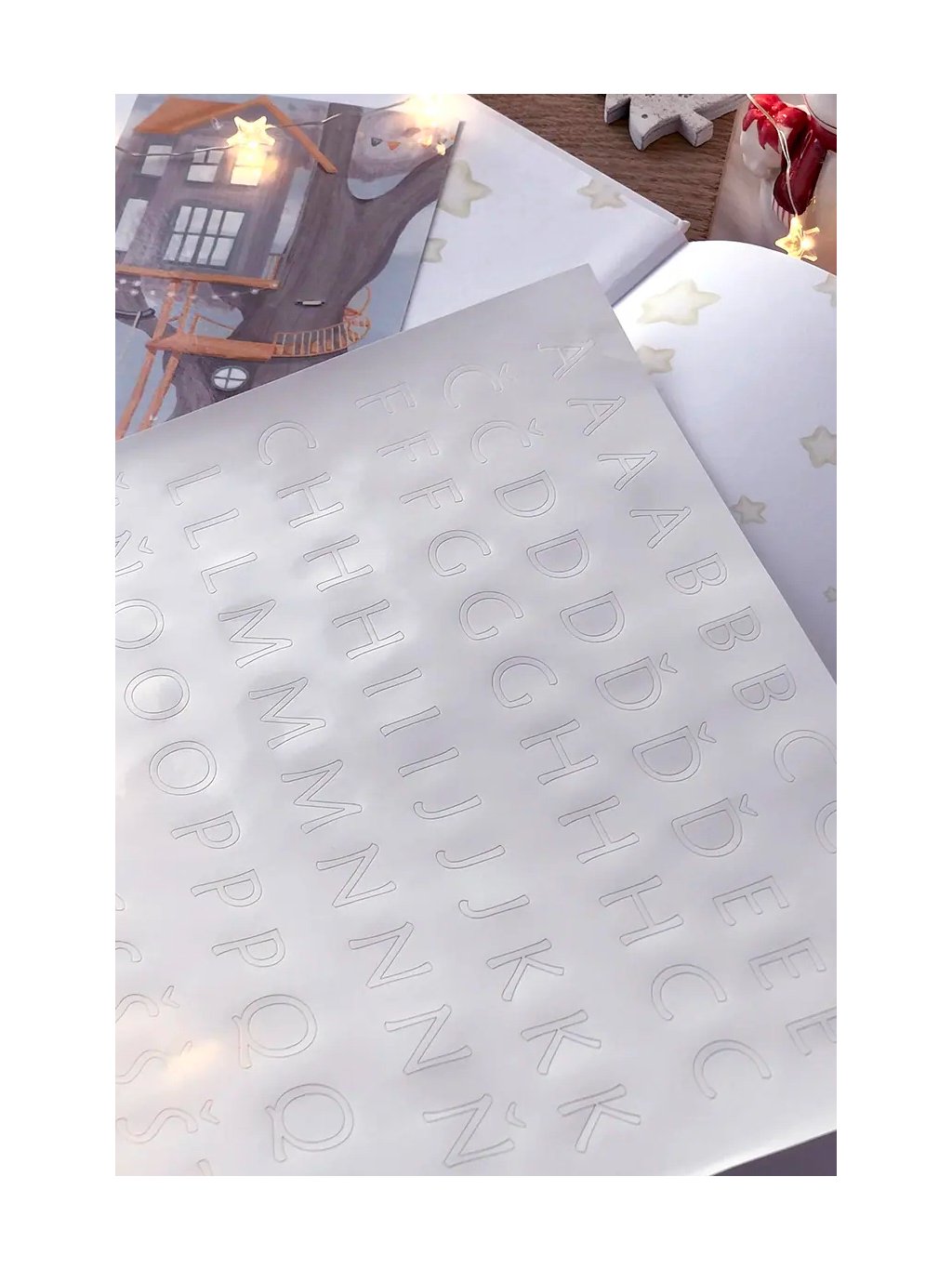 V balení najdete i archy s nalepovacími písmeny, která dají vašemu albu výjimečný vzhled. Velmi snadno můžete pomocí těchto písmen složit jméno vašeho malého zázraku.