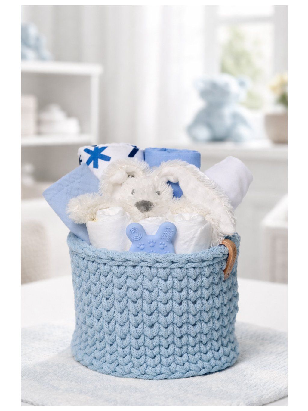 Světle pastelová modrá barva typická pro chlapečka. Háčkovaný košík v této barvě je plný bohaté náplně. Potěší každého rodiče.