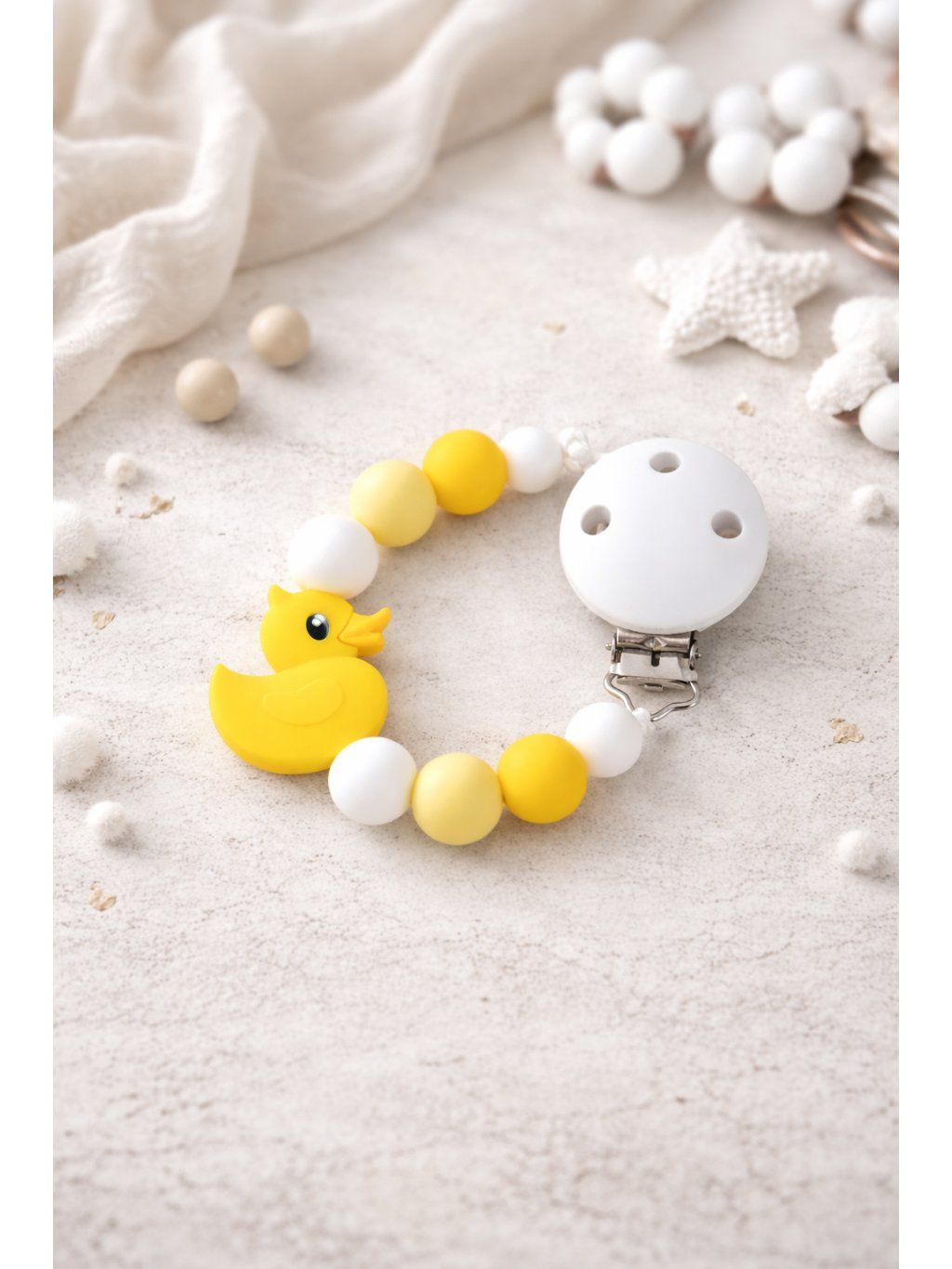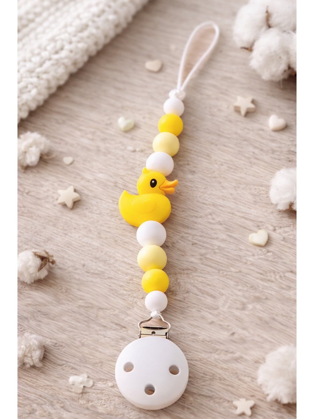 Roztomilé jako ranní slunce! Tento silikonový klip na dudlík s usměvavým žlutým kachňátkem je ideálním doplňkem pro miminka plná radosti. Barevná kombinace bílých, žlutých a světle žlutých korálků působí svěže a pozitivně. Klip je vyroben z potravinářského silikonu, takže je nejen stylový, ale i bezpečný pro jemné dětské dásně.
