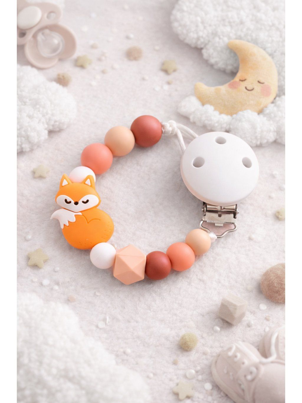 Tento klip na dudlík si zamiluje každé miminko i rodič! Roztomilá oranžová liška v kombinaci s teplými odstíny hnědé, meruňkové, broskvové a bílé vytváří harmonický design inspirovaný podzimem. Korálky jsou vyrobené z potravinářského silikonu – ideální pro jemné dásně při prořezávání zoubků.
