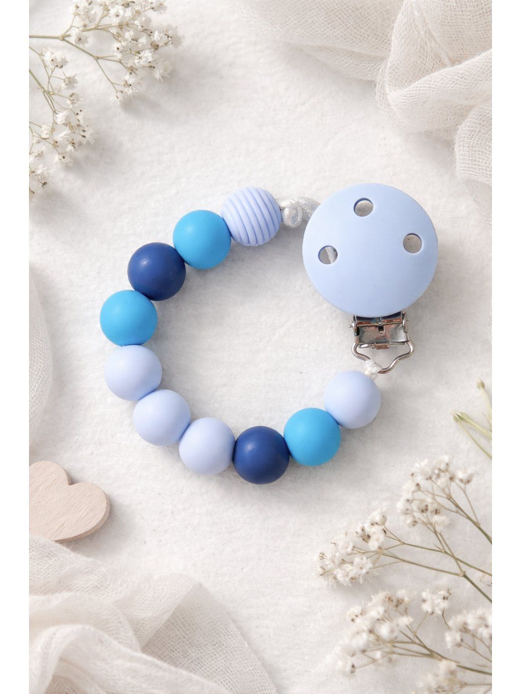 Elegantní a stylový dudlíkový klip v ombré odstínech modré přináší hravost i praktičnost do každodenní péče o miminko. Jemný přechod barev od světle modré přes tyrkysovou až po námořnickou působí moderně a unisex. Korálky z potravinářského silikonu jsou příjemné na dotek i na kousání – ideální pomocník při růstu prvních zoubků.