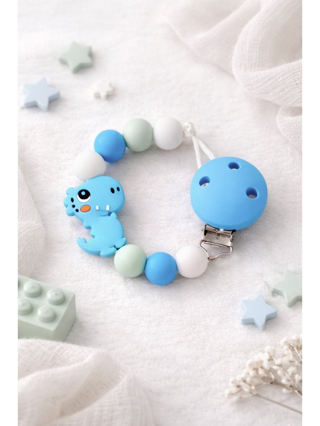 Veselý, barevný a praktický! Silikonový klip na dudlík s modrým dinosaurem rozzáří každý den vašeho miminka. Kombinace modré, bílé a světle zelené působí svěže, hravě a přitom jemně. Roztomilý dinosaurus si získá srdce malých objevitelů, zatímco maminky ocení funkčnost, bezpečné materiály a snadné připnutí.