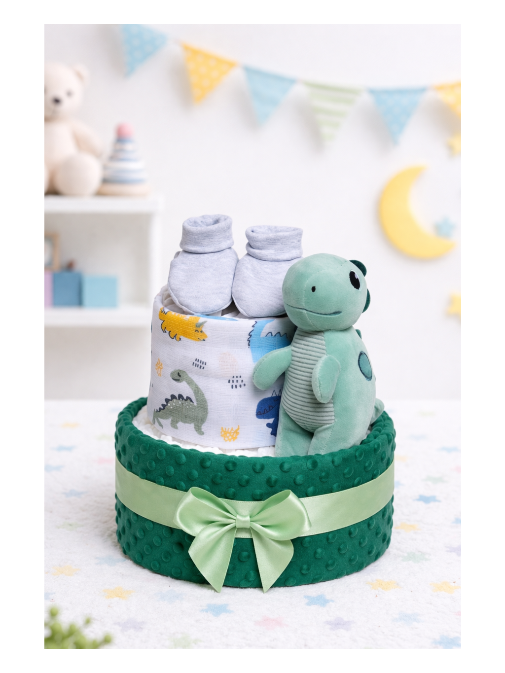Plenkový dort s dinosaurem je stylový a praktický dárek pro novopečené rodiče. Spojuje užitečné věci pro miminko s krásným dárkovým provedením, které zaujme na první pohled. Dort je laděný do jemných zelených tónů a doplněný o roztomilého plyšového dinosaura. Součástí jsou také dětské capáčky a kvalitní plenky, které rodiče skutečně využijí.