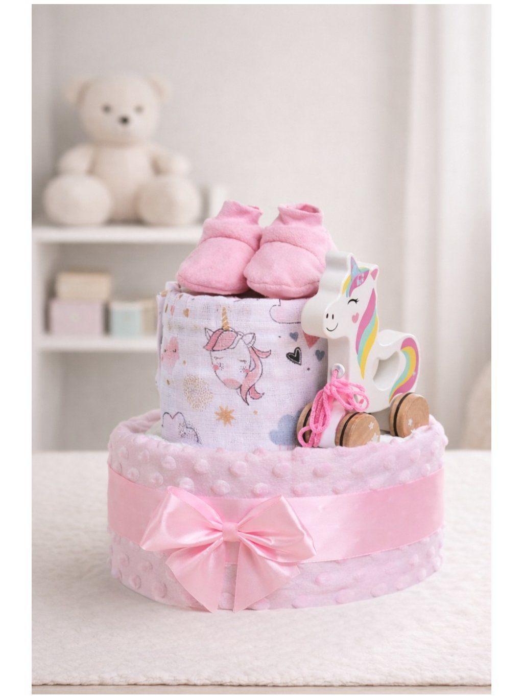 Plenkový dort s jednorožcem je krásný a zároveň praktický dárek pro novopečené rodiče. Kombinuje užitečné věci pro miminko s jemným dárkovým provedením, které potěší na první pohled. Dort je laděný do růžových tónů a doplněný o stylový motiv jednorožce. Součástí jsou také dětské capáčky a kvalitní plenky, které rodiče skutečně využijí. Každý dort je pečlivě ručně vyrobený a připravený k okamžitému předání jako dárek, bez nutnosti dalšího balení.