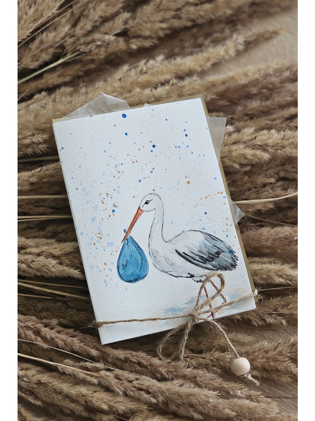 Ručně malované přání s akvarelovým motivem čápa přinášejícího miminko vystihuje radostnou chvíli příchodu nového života. Motiv čápa je tradičním symbolem narození a štěstí. Přání je proto krásným blahopřáním k narození miminka a milým doplněním dárku pro novopečené rodiče. Svým jemným provedením nepůsobí okázale, ale zůstává hezkou památkou na výjimečný den.