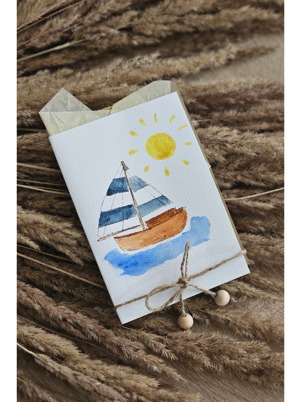 Objevte kouzlo jednoduchosti a lehkosti s originálním ručně malovaným přáním s motivem plachetnice. Tento ručně malovaný design symbolizuje svobodu, sny a nové začátky – proto je ideálním doplňkem pro nejrůznější příležitosti.