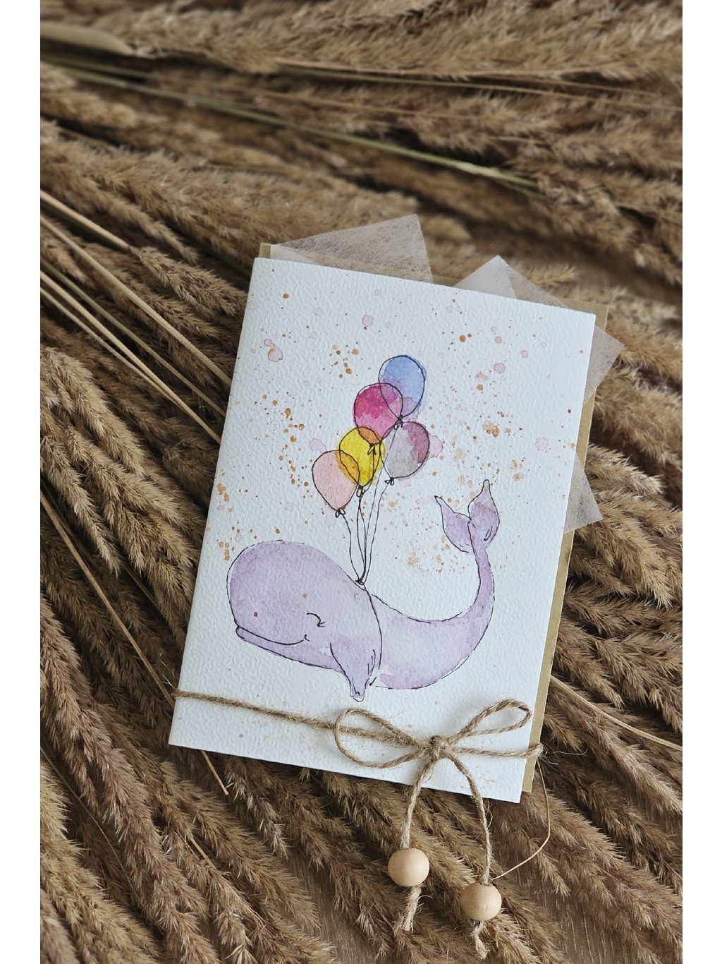 Ručně malované přání, které vyvolá úsměv na první pohled. Jemná akvarelová ilustrace roztomilé velryby nesoucí barevné balónky působí hravě, radostně a plná fantazie. Je to originální způsob, jak pogratulovat k narozeninám, oslavě či jen tak poslat kousek radosti někomu blízkému.